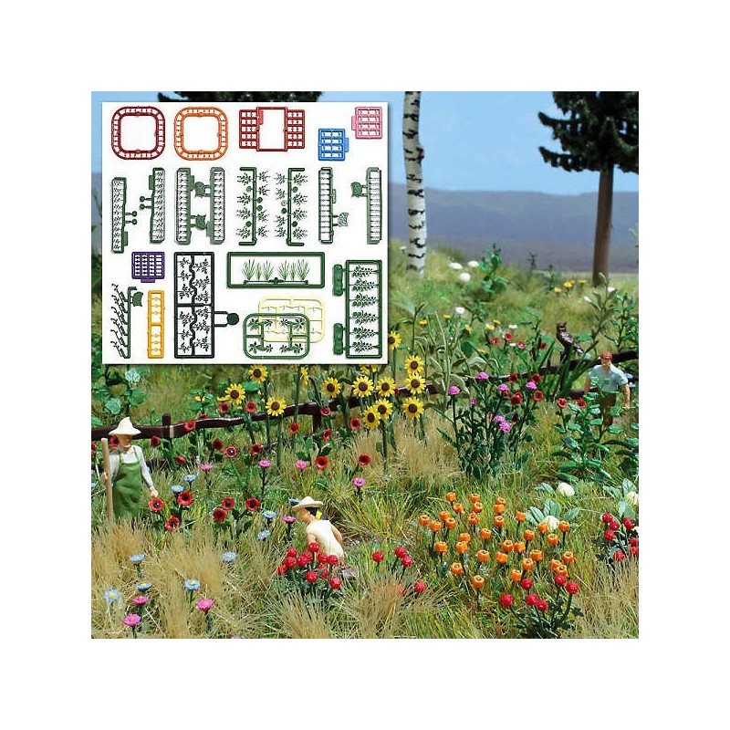 Plantas y flores variadas, 100 unidades 1258 Busch Escala H0. Se incluyen margaritas, tulipanes, rosas, amapolas, plantas de verano y vegetales