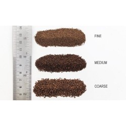 Balasto color marron oscuro de grano grueso B85 Woodland Scenic, en formato de bolsa de 383 cm3. Recomendamos para escala N el balasto fino o medio y para escala H0 el medio o grueso. Adjuntamos un video de tecnica de aplicacion mas abajo. En la segunda imagen puede apreciarse el tamaño del grano respecto a una regla