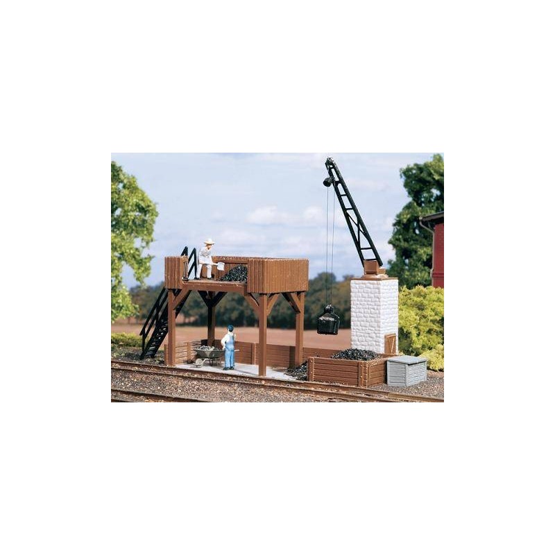 Con un almacén de carbón de madera y espacio debajo de la plataforma de madera. La grúa levanta el carbón en una cesta.