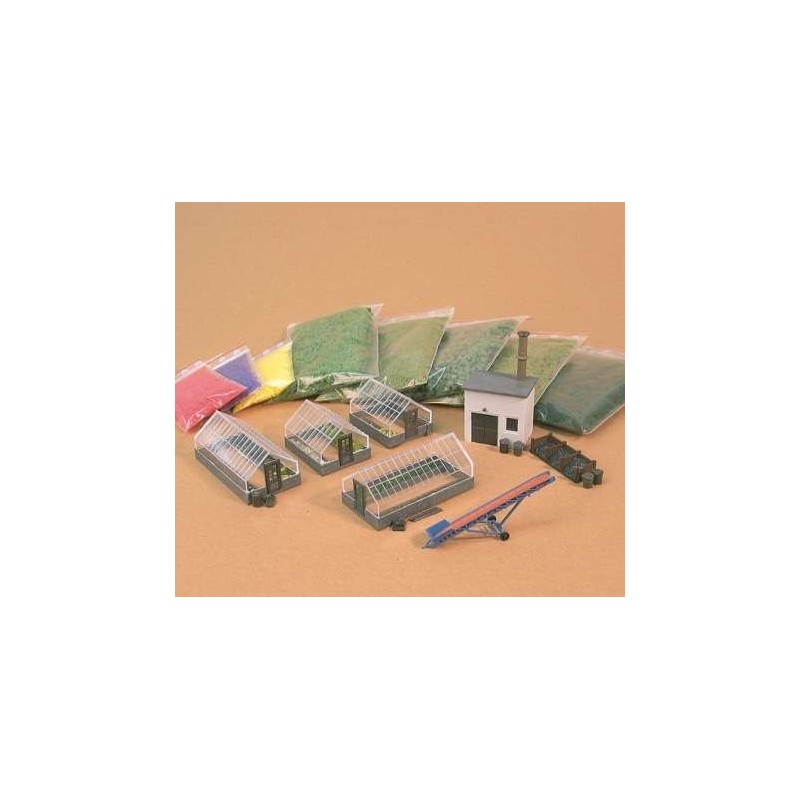 Vivero 12351 Auhagen Escala H0. Se incluyen 4 invernaderos, flocajes y flores de varios colores, una caseta, cubos de basura, etc....